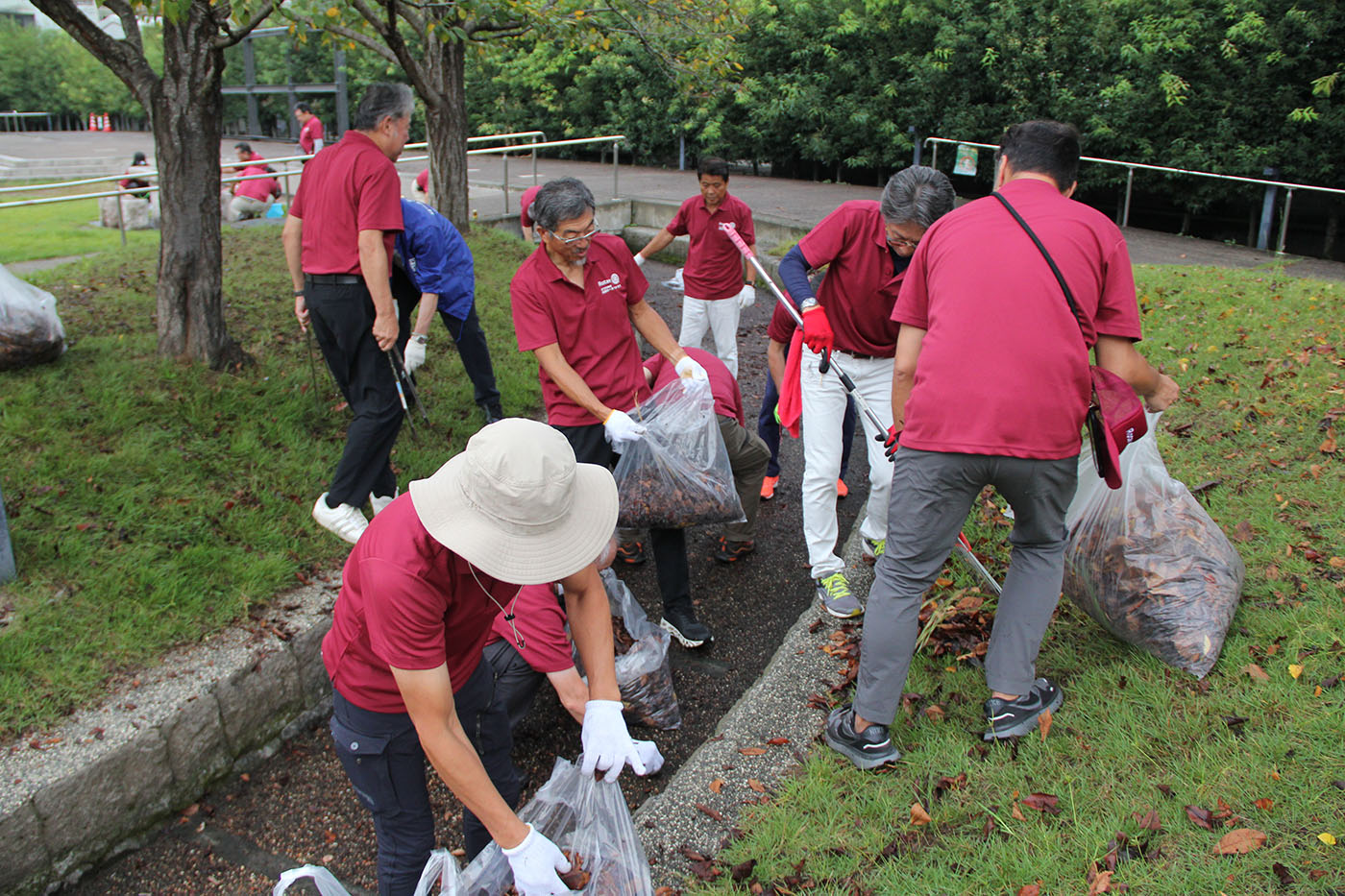 早朝例会を開きパトリア前中央公園の石製のテーブルと椅子をきれいに磨き、周辺の落ち葉を集める清掃活動をしました。